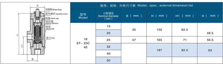 STC系列可調恒溫式疏水閥屬熱靜力型中的一種產品。閥內感溫元件中裝有感溫劑、飽和劑、穩定劑和填充劑組成的感溫混和物.利用其對溫度的熱脹冷締殛狀態變換,使得閥門自動關閉或開啟,從而達到阻汽排水之目的。