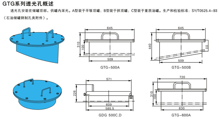 裝于油罐頂部,供罐內采光用,A型裝于平錐項 罐,8型裝于拱項油罐,C型裝于重質油罐,本產品不帶加強板。