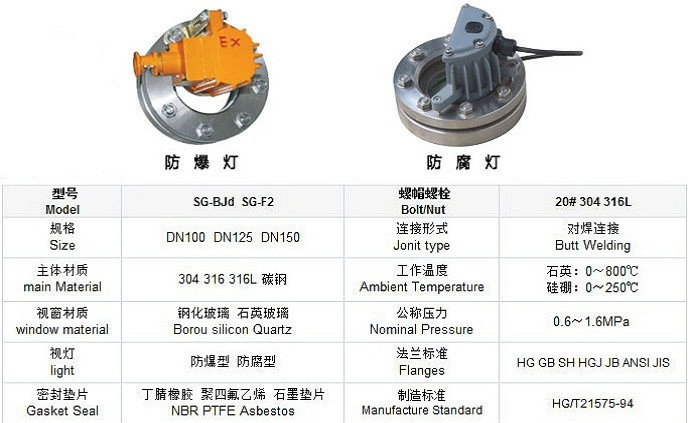 帶燈視鏡,帶防腐燈視鏡,帶防爆燈視鏡廣泛應用于管道、設備裝置中重要附件。該視鏡主要由視鏡底板、視鏡玻璃、緊固件、密封件組件等組成。帶燈視鏡安裝于壓力容器、真空容器、罐體、反應器、過濾器、沸騰床等罐體和密閉容器上,在承受與容器相同壓力、溫度條件下觀察容器內部情況;也可用于溫度高,腐蝕性強、易中毒、危險性較大,易結晶的化工塔器中,以保證其安全生產。當觀察環境昏暗時,需要配置視鏡射燈,其中分為防爆型和防腐型兩種形式。
