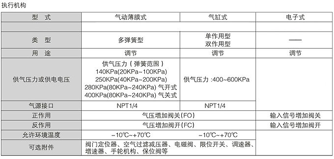 執行機構:氣動薄膜式執行機構、氣動活塞式執行機構、電動執行機構