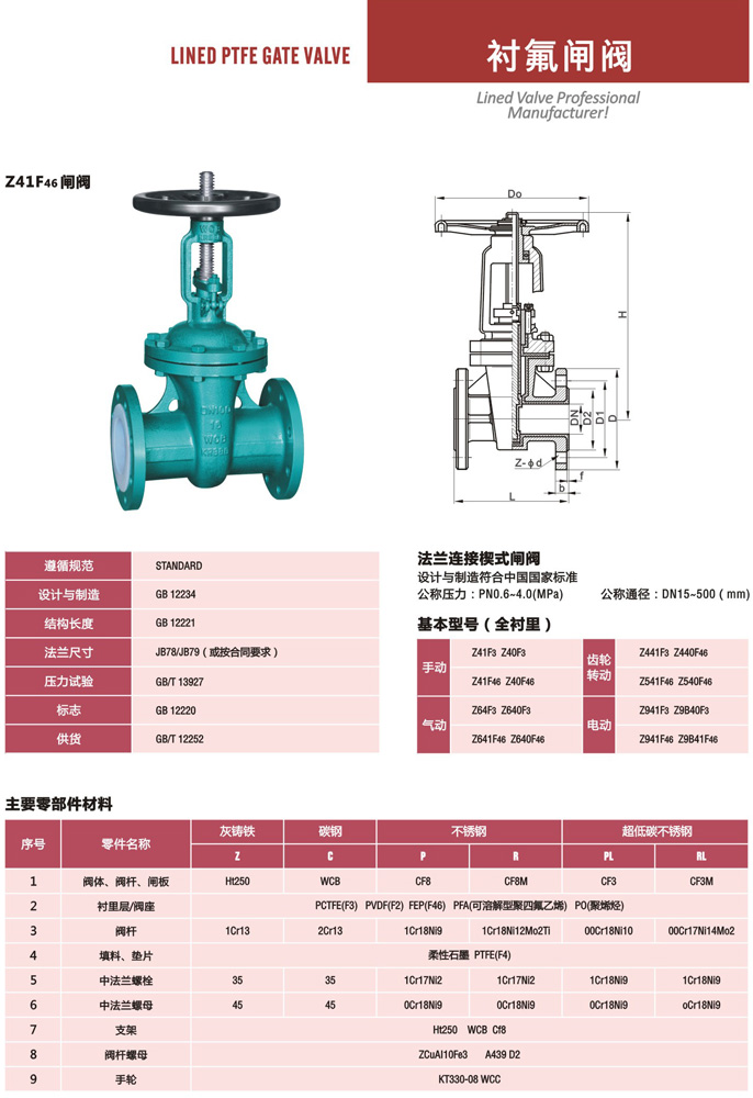 1、閥體、閥蓋的內腔和閘板、閥桿外表面等直接與介質接觸的部件,全部名襯FEP(F46)等氟塑料;