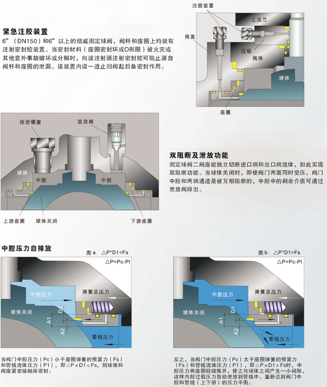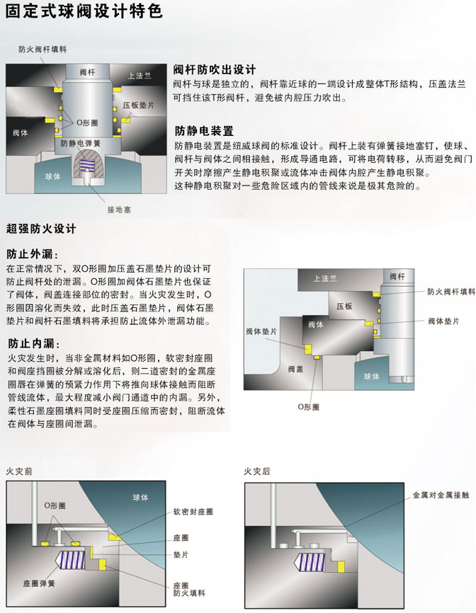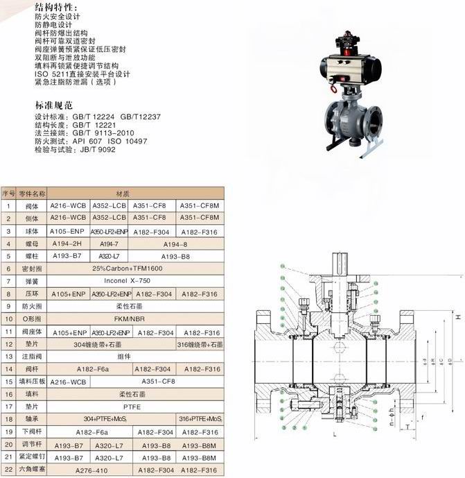 氣動固定式球閥,氣動固定式法蘭球閥:兩片式和三片式固定球閥又稱測裝分體式球閥,將閥體沿與閥門通道軸線相垂直的截面分為不對稱的左右兩半,它在管道上主要用于切斷、分配和改變介質流動方向。它的樞軸結構準確的球體位置。標準閥座采用彈簧結構,將閥蓋推向球體,好的低壓密封性能。該球閥閥前、閥后閥座都能密封, 即所謂雙向密封特性,利用自帶的排放閥,閥體中腔可向外排放。樞軸采用防爆出保護結構,低摩擦系數的軸承等?煽啃愿,用途廣泛,價格合理等。