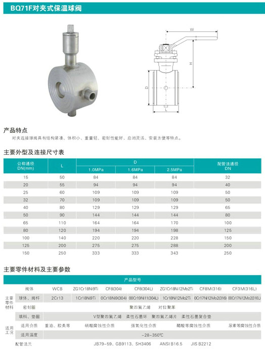 對夾式保溫球閥,BQ71F保溫球閥主要型號:手動(BQ71F)氣動(BQ671F)電動(BQ971F)BQ71F對夾式保溫球閥主要應用于化工、石油、制藥、冶金等行業的系統管路中,主要作用是輸送在常溫狀態下會凝固、易結晶的介質。具有結構緊湊、體積小、重量輕、密封性能好、啟閉靈活、安裝方便等特點。
