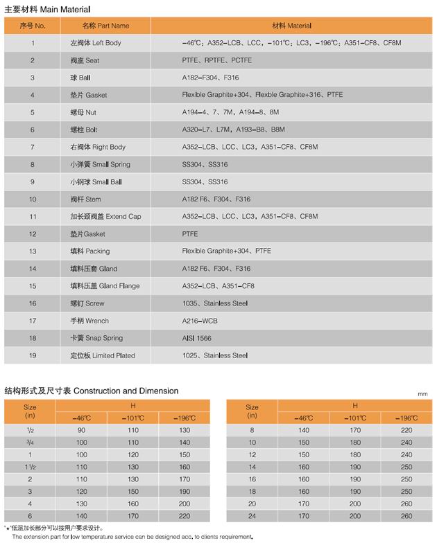 液化天然氣閥門的材料非常重要,材質不合格,會造成殼體及密封面的外漏或內漏;零部件的綜合機械性能、強度和鋼度滿足不了使用要求甚至斷裂。導致液化天然 氣介質泄漏引起爆炸。液化天然氣閥門的過程中,材質是首要關鍵的問題。閥體、閥蓋采用:LCB(-46℃)、 LC3(-101℃)、CF8(304)(-196℃).