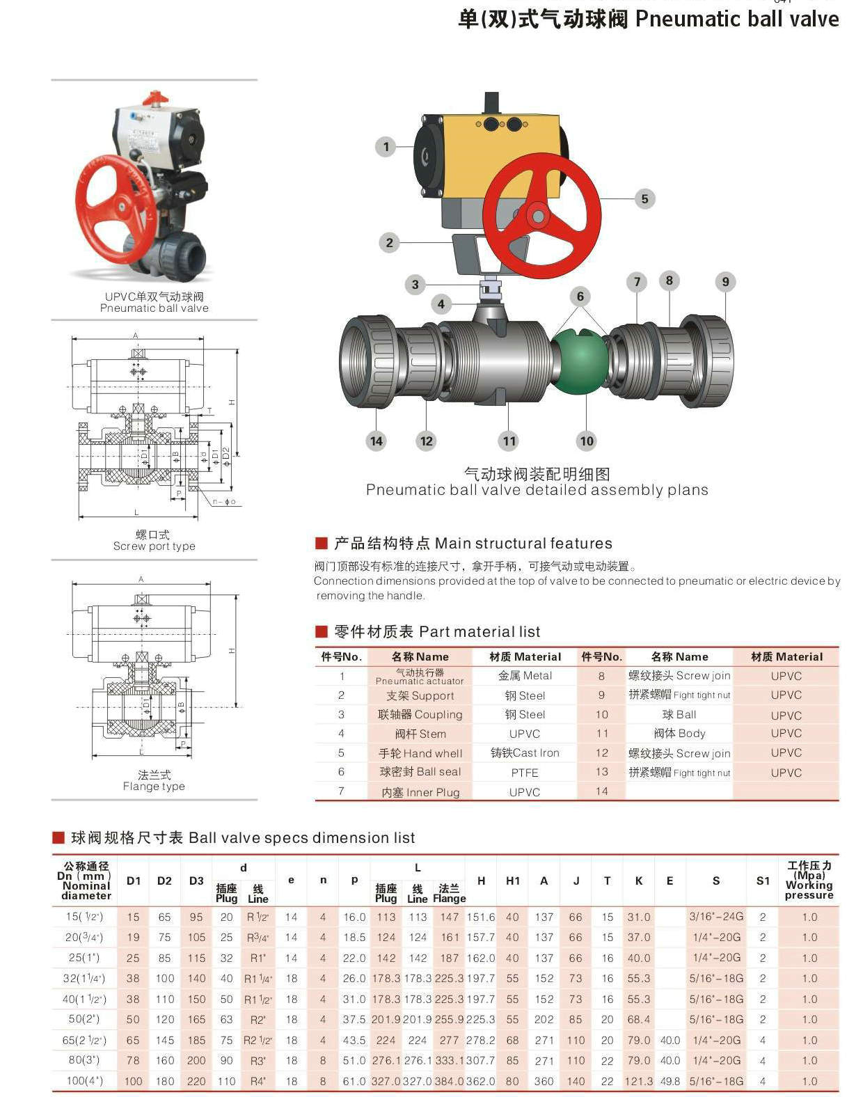 氣動塑料球閥_氣動(UPVC,CPVC,PVC,PVDF)球閥參數尺寸圖: