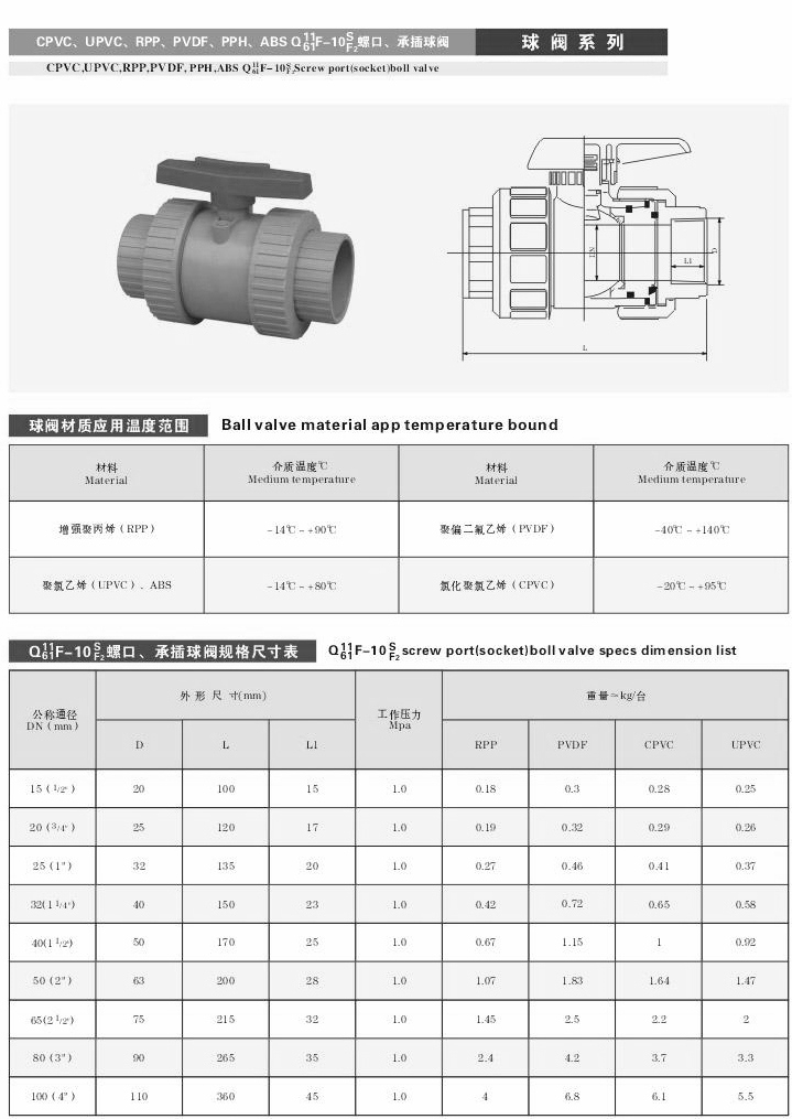 UPVC塑料球閥,UPVC球閥主要用于截斷或接通管路中的介質,亦可用用于流體的調節(jié)與控制,它與其它閥 類相比,具有以下一些特點。流體阻力小、球閥是所有閥類中流體阻力小的一種,即使是縮徑球閥,其流體阻力也相當小。而UPVC球閥是根據(jù)各種腐蝕性管道流體需求的一種材料球閥產(chǎn)品。產(chǎn)品:閥體重量輕、耐腐蝕性強,外型結構緊湊美觀,本體重量輕容易安裝,耐腐蝕性強,應用范圍廣,材質衛(wèi)生無毒,耐磨損、容易拆卸,維護簡單易行。