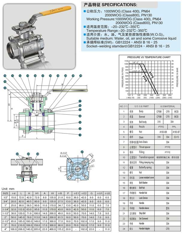 承插焊球閥,三片式承插焊球閥參數尺寸圖: