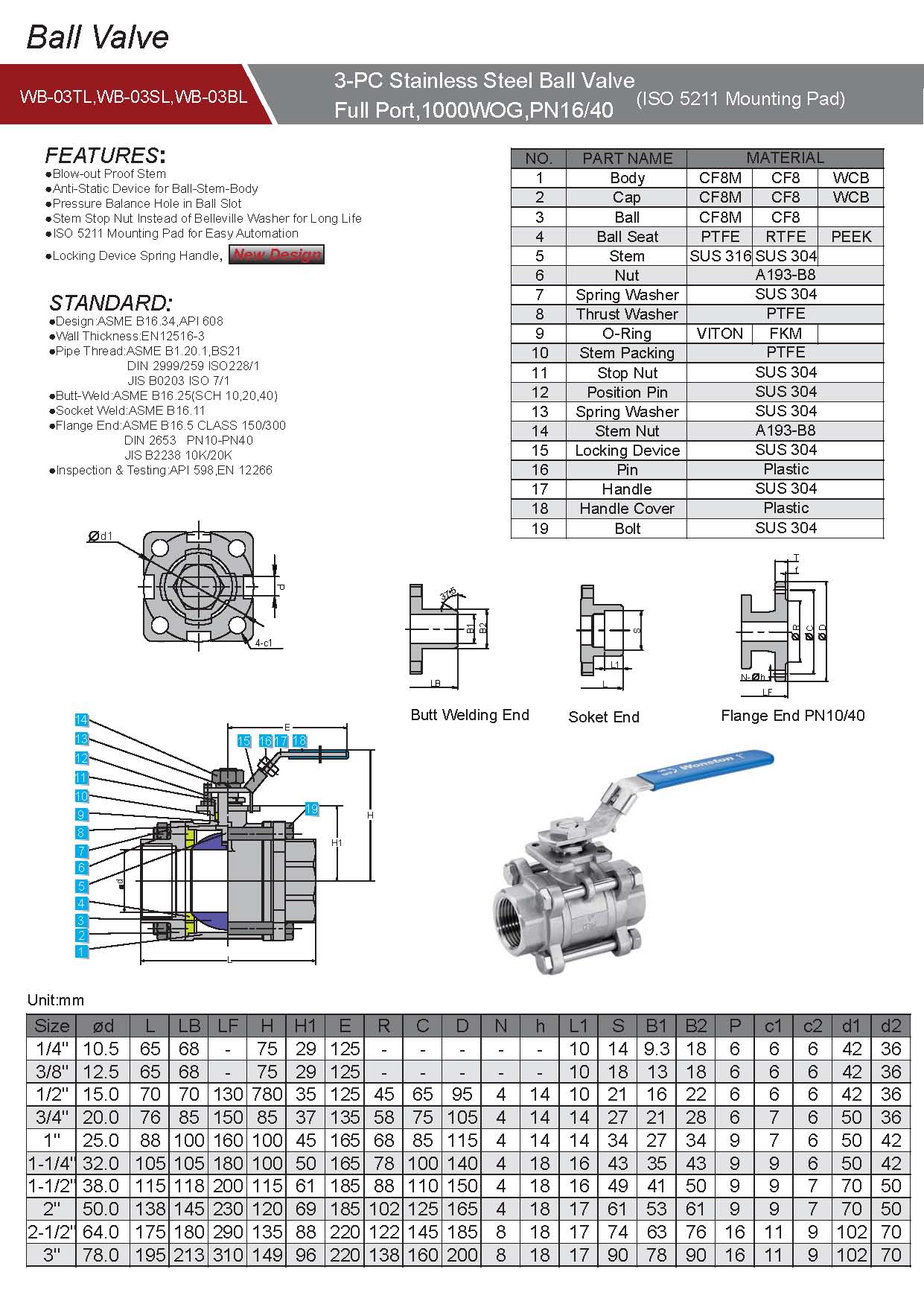 三片式球閥閥體鑄造,結構合理、造型美觀。閥座采用彈性密封結構,密封可靠,啟閉輕松。 閥桿采用有倒密封的下裝式結構,閥腔異常升壓時,閥桿不會被沖出。二片式、三片式球閥連接形式另有對焊(BW)承插焊(SW),并均可帶標準ISO支架平臺和鎖定裝置?稍O置90°開關定位機構,根據需要加鎖以防止誤操作,驅動方式:手動、電動、氣動。