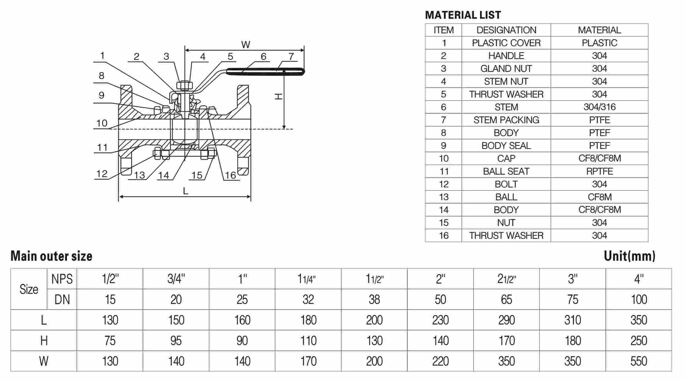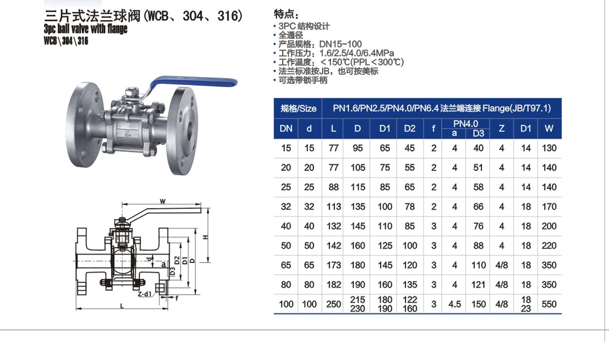 三片式法蘭球閥適用介質:水、油、氣及某些腐蝕性液體(W.O.G)用穩(wěn)定范圍:-20~232℃~350℃公稱壓力:1.6-4.0MPa