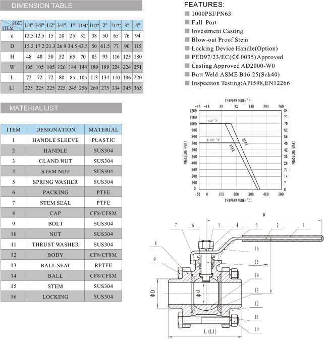 三片式對(duì)焊球閥適用介質(zhì):水、油、氣及某些腐蝕性液體(W.O.G)用穩(wěn)定范圍:-20~232℃~350℃公稱壓力:1.6-4.0MPa