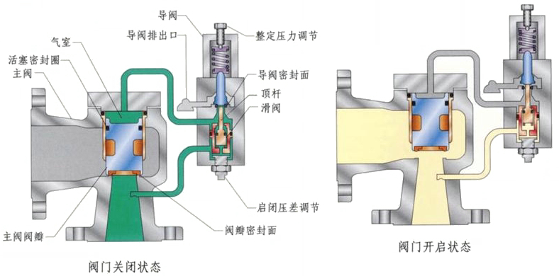 先導式安全閥是利用導閥來感測被控壓力信號并給出信號,當安全閥前的壓力低于整定壓力時,導閥和主閥都處于無泄漏的關閉狀態。主閥通過導閥的供應導管,作用于導閥閥座和主閥閥芯頂部,由于閥芯的頂部大于底部(閥座區)作用力使閥芯保持向下,閥前壓力越接近整定壓力關閉越嚴密,這種自密封結構在主閥硬軟雙質密封副作用下,凈密封力隨著管道壓力增加和接近設定點而增加。當閥前壓力達到或超過整東壓力時,導閥開啟,主閥迅速打開,介質排放;當閥前壓力回到整定壓力以下時,導閥關閉,主閥也隨之關閉。